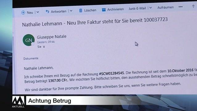 WiedergabelisteSchlagzeilen1 MinMännerchor Frohsinn verstummt3 MinGerechtigkeit für Ente Bella1 MinSwissNews1 Min„Umweltpolitischer Unsinn“2 MinVorsicht: E-Mail-Betrug3 MinWorldNews1 MinKrähensuppen-Aktion fehlgeschlagen3 MinAktuell — Dienstag, 11. Oktober 2016 — Ganze…14 MinVorsicht: E-Mail-BetrugWer von bekannten Firmen Mails mit Zahlungsaufforderungen erhält, soll sich in Acht nehmen. Viren und Trojaner tarnen sich dahinter.